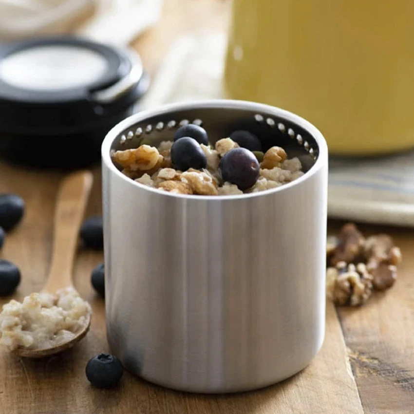 The updated lid creates an all-stainless interior so food never comes into contact with plastic, locks in leakproof storage in just a quick quarter turn and features an easy-carry swivel loop.