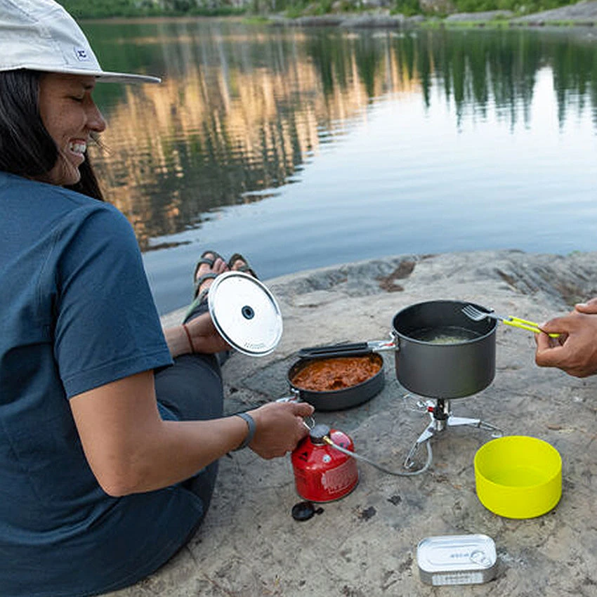 The foldout legs create a wide, stable base that significantly lowers your stove height, for stability on uneven ground or when cooking around young campers. It also allows stoves of nearly any size to support larger pots and pans with ease. The remote valve and fuel line move the flame control away from the stove and pot, making cooking adjustments easier (no more sticking your hand under a full boiling pot). And it folds up nice and compact for easy stowing.