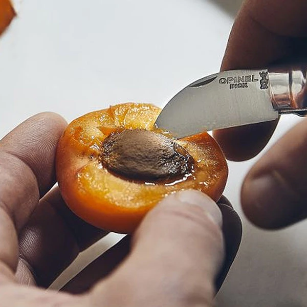The N°07 Chestnuts, Garlic and Pitting Knife features the Virobloc safety ring, invented by Marcel Opinel in 1955 and now cut out of stainless steel. the Virobloc has two sections, one fixed and one sliding. In addition to locking the blade open (safety in use), it is now possible to lock the blade closed (safety in transport).
