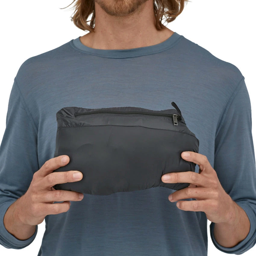 Centre-front zipper has an interior storm flap and zipper garage at chin for next-to-skin comfort, with two on-seam handwarmer pockets with welted zippers, an internal zippered chest pocket that converts to stuffsack with carabiner clip-in loop and drop-in interior pockets. Includes a repair patch to use for quick fixes on the go.