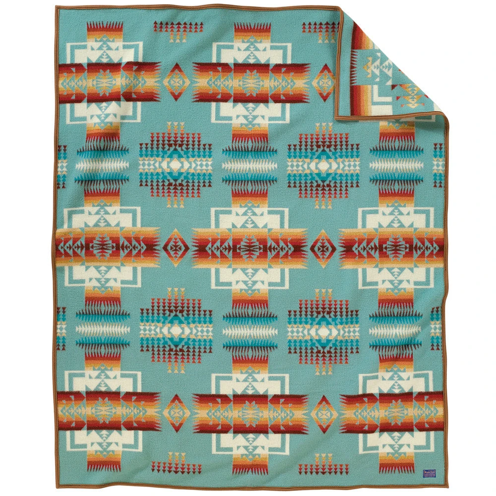 From Pendleton: “The blanket pattern celebrates the heroism of the Northwest’s great Nez Perce leader, Chief Joseph. Its design is balanced with arrowheads symbolising bravery and pointing in all directions of Mother Earth. The Chief Joseph is a woven jacquard that is reversible to offer two dramatically different looks.”