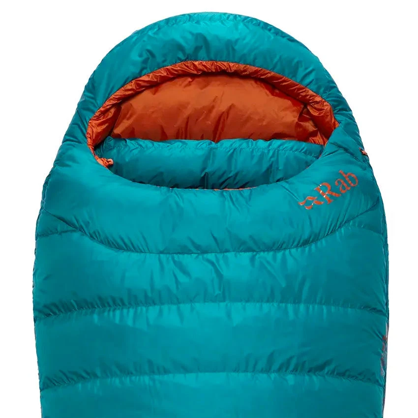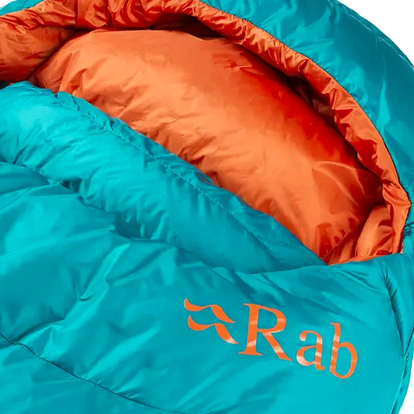 Slightly shorter in length, narrower at the shoulders, and wider at the hips than the regular Ascent Sleeping Bag. It has trapezoid shaped, boxwall baffles that stack neatly together, encouraging the hydrophobic duck down inside to loft fully and reducing the appearance of any cold spots. All of Rab’s sleeping bags are hand-filled in the UK and conform to the Responsible Down Standard, independently certifying down against animal welfare requirements and tracking it from the source to the final product. The generous mummy fit with wide foot box provide a spacious feel for an easy night’s sleep, and the close-fitting neck baffle keeps the heat in when the temperature drops. It has a ¾ length main zip with a down filled baffle to keep out the draught.